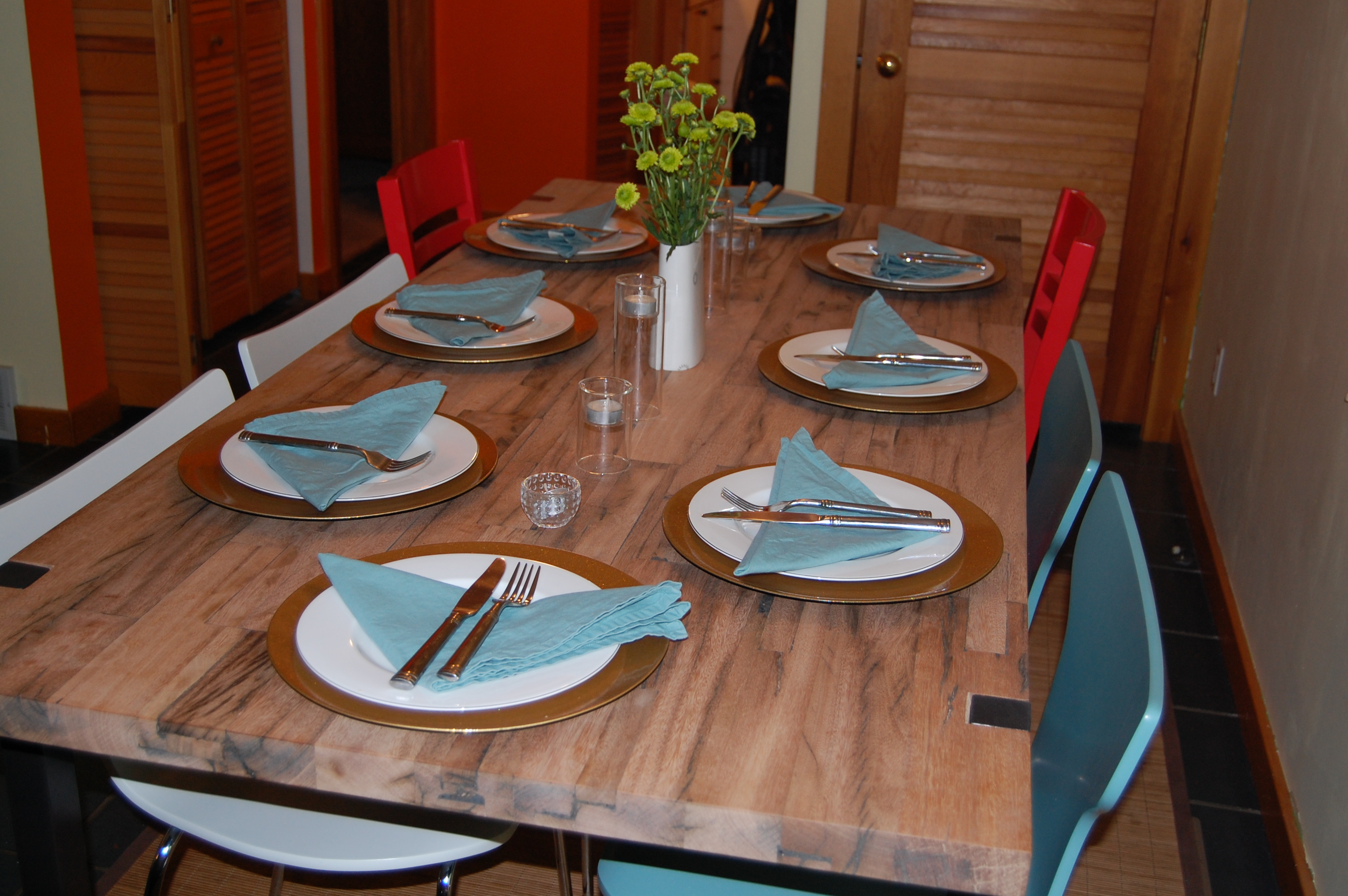 Sunday afternoon is here and I do declare that I think Thanksgiving 2009: Family Merge was a success! Folks arrived in waves with my family coming for the game at 11:30 and Aaron’s family coming in two shifts — one around 1:30 and the next closer to 3:30. We ate around four and, of course, were done twenty minutes later. Ok, maybe the meal lasted longer than that but it’s always so much work and worry and getting ready and then — poof! It’s over. Though, to be fair, it wasn’t that much work for me since my role was more cleaning and catch-all while Aaron slaved away in the kitchen. And I mean that — he worked hard. And has the sweat stains to prove it. In addition to turkey, we served garlic mashed potatoes, Brussels sprouts with homemade bacon, ginger and orange carrots, and garlic green beans (my favorite part of the meal). Aaron’s mom generously brought two kinds of stuffing — one sans ‘shrooms since I can’t stand them, as well as her signature dessert. Terry, Steve & Mags brought multiple pies (apple, dutch apple and homemade pumpkin), sweet potatoes and copious amounts of wine. My mom brought the hors d’oeuvres — chips and guacamole (Whole Foods), bean dip and salsa (both from Pasqual’s — the best); shrimp; cheese and crackers; crab dip; spinach artichoke dip; potato chips; and fruit. She also brought the cranberry relish and the rutabaga (blech!). What else? Oh! Aaron served his homemade smoked fish (white fish and trout). Ok, I think that about does it. So, in all, it was a lot of work but we also had tons and tons of help and I really had a good time. The star of the show, though, you might think was the turkey or the homemade bacon but, in my opinion, you’d be wrong. The real star was…my table! Gosh, how I love it. Second and third place can go to the other two contenders.