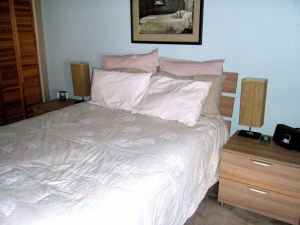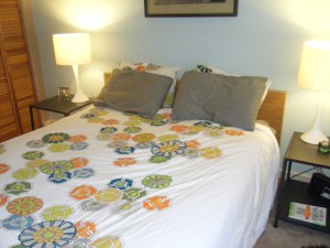 On a much lighter note, my bees are now out of my bonnet! Well, mostly. Well, mostly as far as the bedroom goes, I guess. I mentioned a few posts ago that I woke up one morning, tried to move my bed, broke it, tossed it and was waiting the arrival of a new one from CB2. I also mentioned that I decided that the new bed would require new nightstands and new lamps. I mean, obviously. New bed would not have been happy with nasty old nightstands and pretty lamps, but ones that wouldn’t have meshed with new bed. After looking around online a bunch, I had settled on nightstands and lamps from CB2, as well. And, of course new bedding. I’ve discovered that some folks change their bedding seasonally, some not at all and then some are like me. I like to fall in love with new bedding and keep it for a few years until I tire of it and then opt for something new that I fall in love with. Usually I keep the old bedding in storage, but this time I just tossed it. It was pretty ratty and I was severely annoyed by it. Wasteful? Yeah, maybe, but I have a one-bedroom condo a little over two miles from my work so I don’t think I break the top 100 in terms of environmental offenders even when I tossed out the old bedding. If you remember, and especially if you don’t, this is how the bedroom looked before Operation New Bedroom began:
