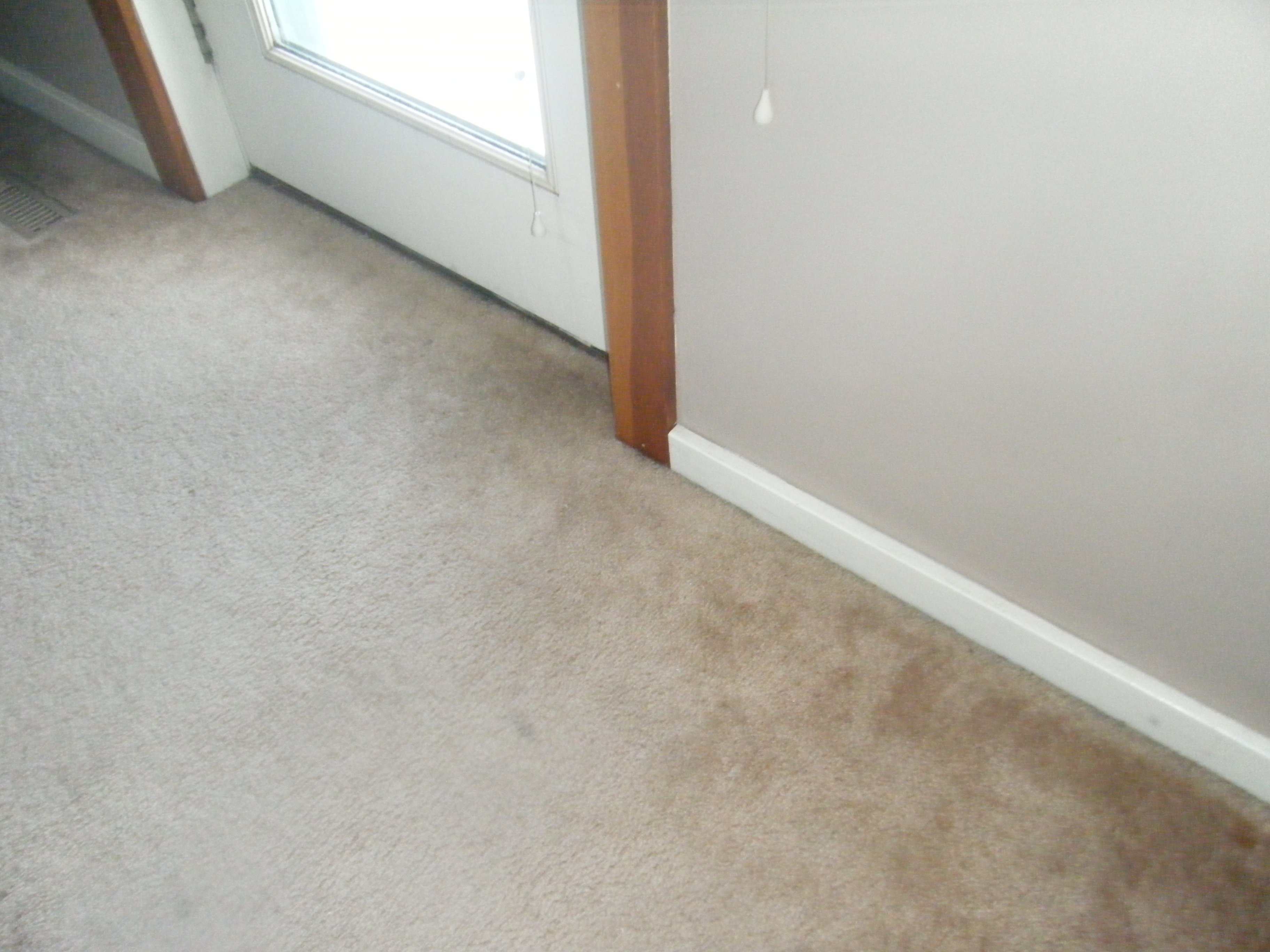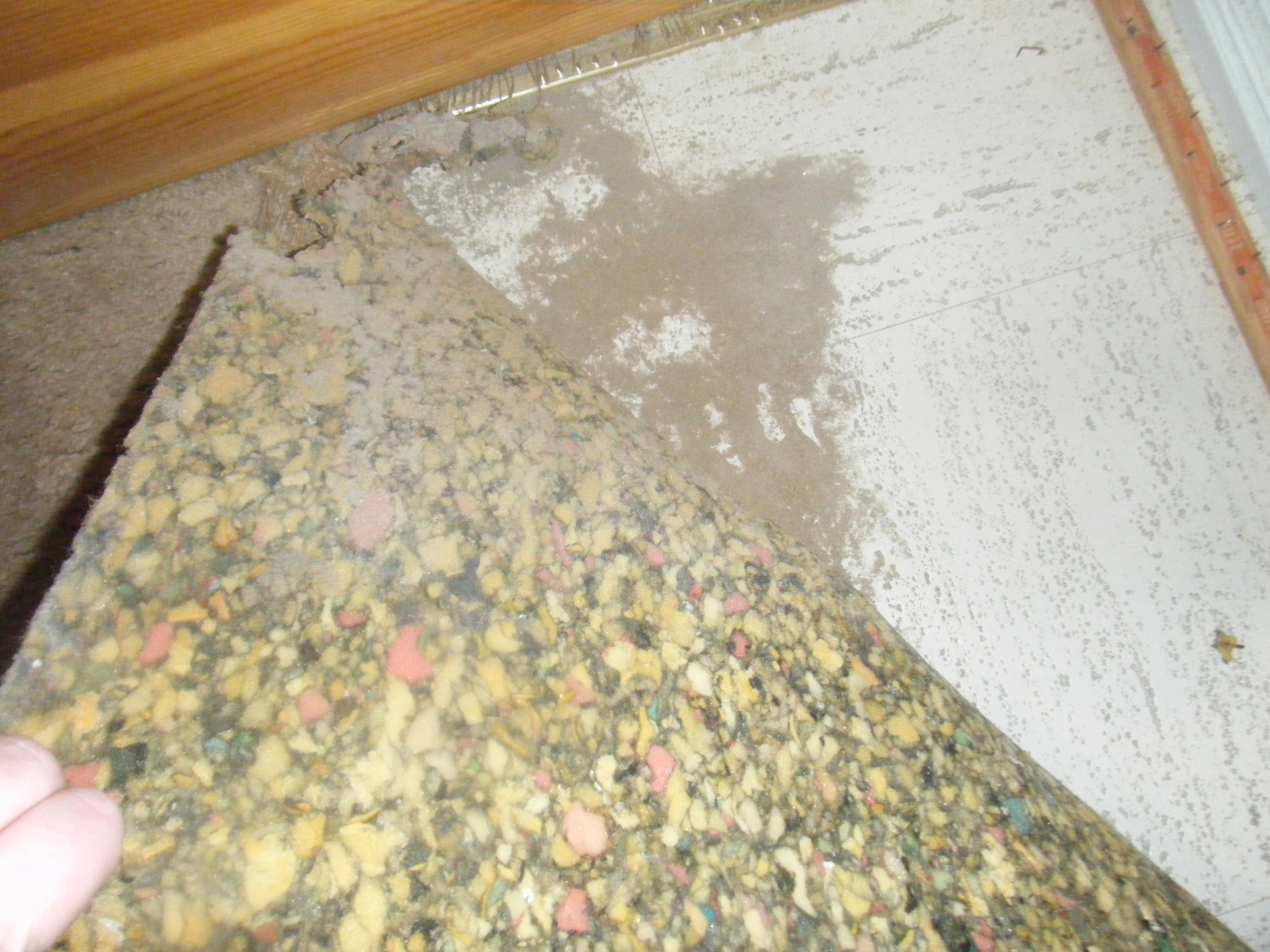 It just has to go.  I’d like hardwood with a plush rug instead, but I don’t know that I can make that happen anytime soon.  I’ve been curious for a long time what was under this nasty rug.  I figured it wasn’t much because the building is from 1985 and the carpet looks pretty old, maybe even original.  So, what did I do?  I started to pull the rug up.  I was scared: what if I was about to destroy my bedroom?  But my curiousity won out and I am glad it did.  I think I found one of the reasons (other than Gracie) why I need to use my inhaler ten times a night when I sleep in my bed.  Sorry for the horror shot.