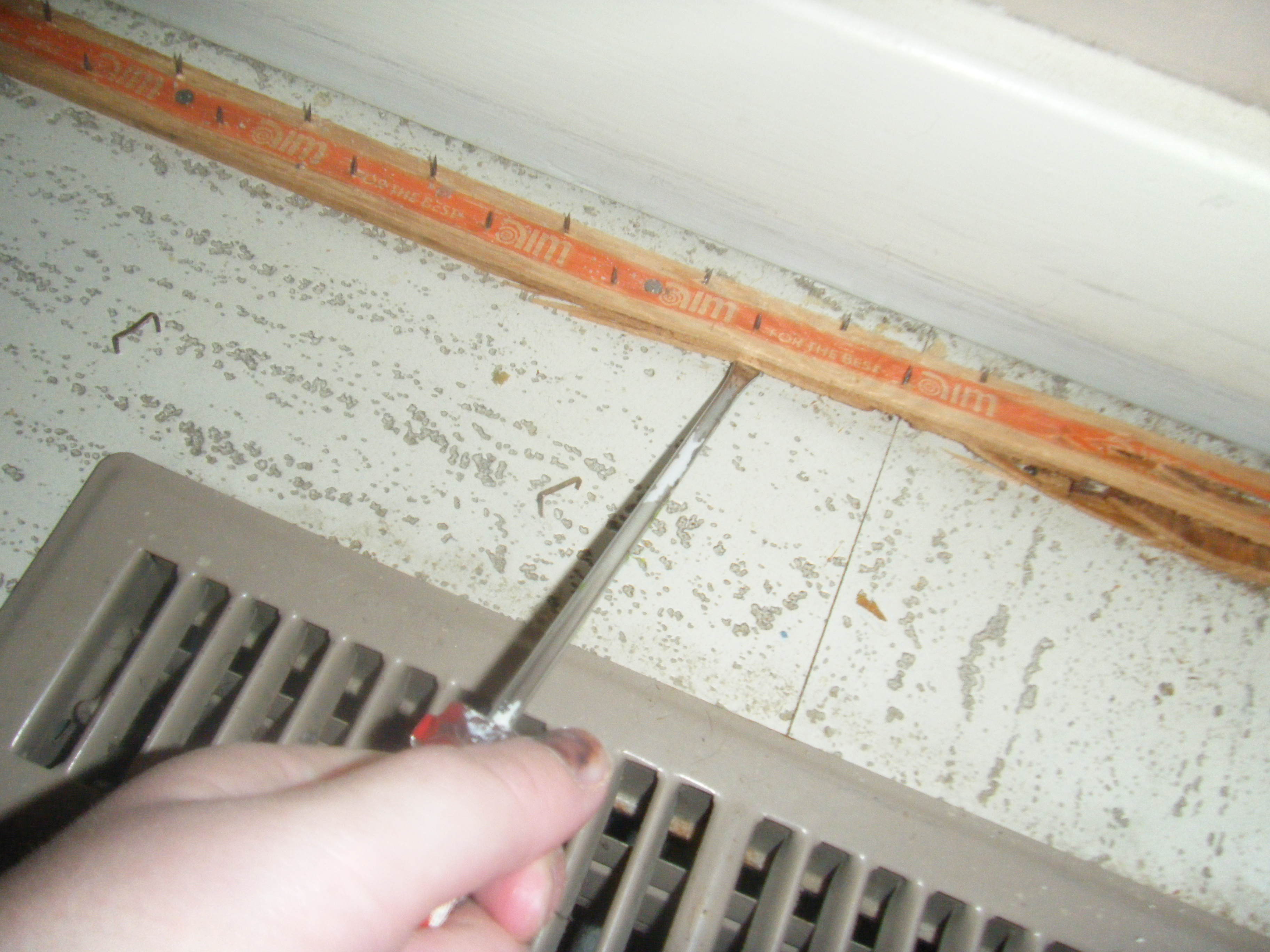 Once I had all of the carpet up, I threw it outside (our bedroom has an outside door in it that accesses our deck — I’ve never been so grateful for that. Had I had to drag all of that nastiness through the house…well, I don’t even want to think about it). Back to the Internet!  How to remove that ubiquitous carpet tacking?  Easy!  Take a screwdriver and wedge it underneath the tacking; lightly tap the end of the screwdriver with a hammer; pry it up; and pull out the nails in the floor with the claw-end of the hammer.  Use the screwdriver and pliers to pull up all of the staples around the room (the staples are used to keep the padding down).