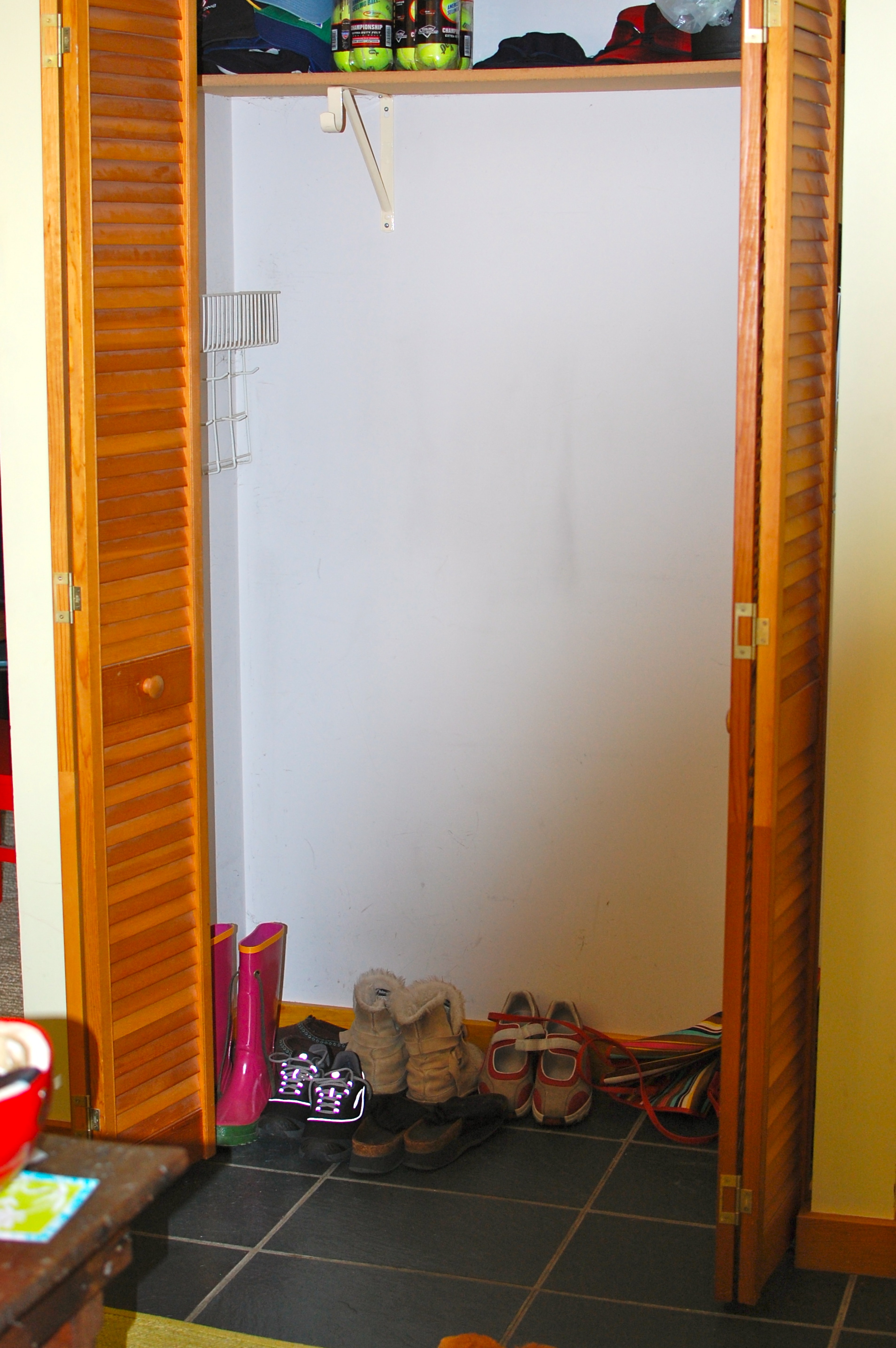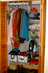 The other project of the weekend was my insistence, inspired by a recent Real Simple article (subscription given to me by my lovely mother-in-law), to reinvent the coat closet in our condo. I think of the closet as large for a coat closet, approximately 48″ wide and 24″ deep, but according to virtually any closet organizing system, it is apparently the smallest closet any closet artist contemplates. Undeterred, we spent a significant time in the woefully understocked closet section at Home Depot. Despite what it may seem like, I am not in love with Home Depot. Frankly, I wish we had a large, local hardware store. Or a Lowe’s. In any event, yes, we shopped at Home Depot and bought lots of metal accoutrements to remake this closet.