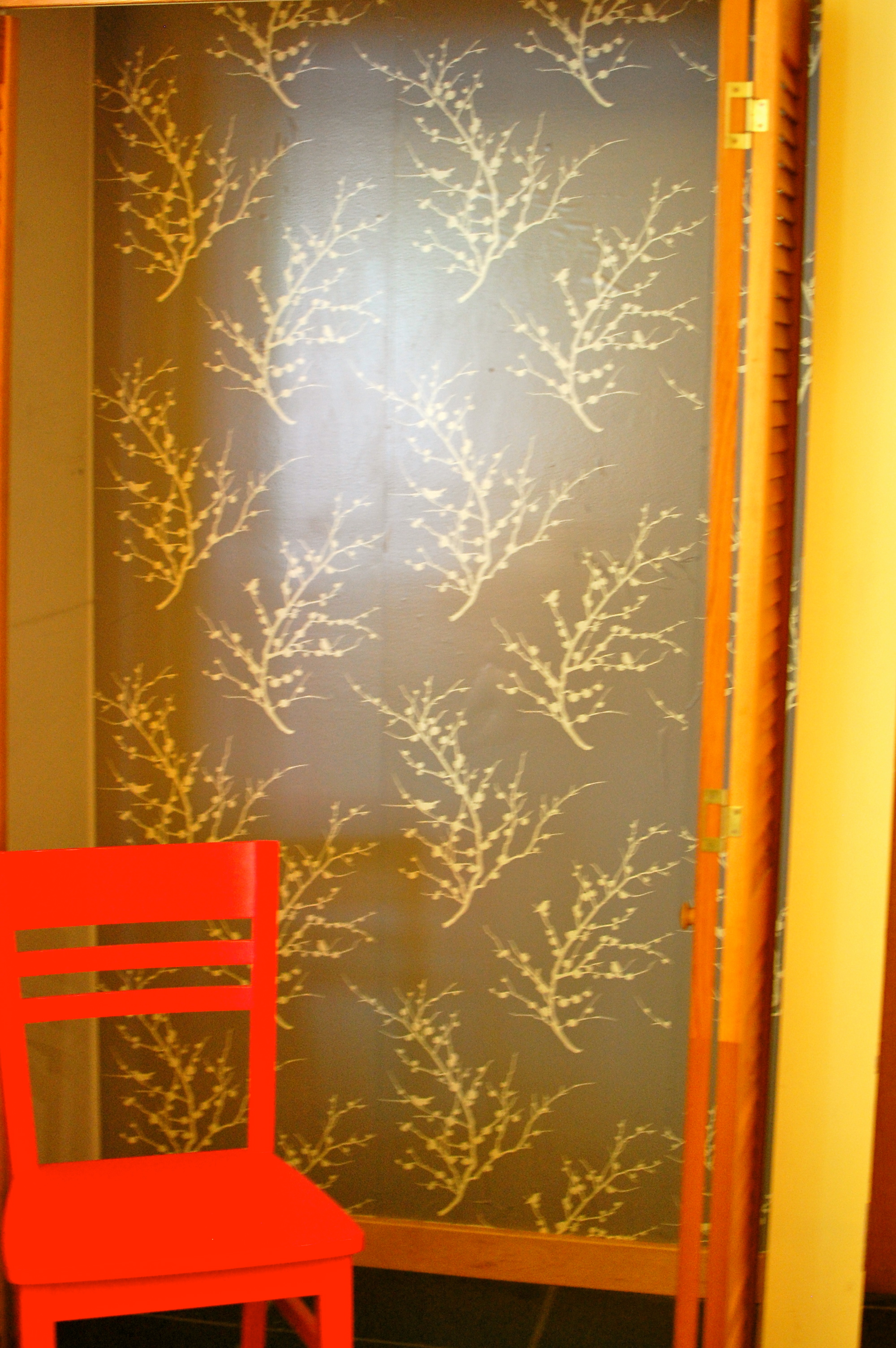 Ok, so in my haste to remake my world, I forgot to take pictures of the closet with all of the coats and crap in it, but you get the idea. Aside from one hanging organizer, the closet was the same as it was when I moved in in 2005. There was the high shelf, as you can see, a closet rod, as you can also see, and two of those white wall-mounted organizer things. And, with the addition of the hanging organizer from Ikea I added, that was the closet. So, I decided that I first needed a little more wow in the closet. Taking my cue from the Real Simple article, I ordered self-adhesive wallpaper. Although the pattern choices were few, they were really great. Because the closet is on wall painted a lemon yellow, that meets a wall painted grey, I opted for a darker grey wallpaper with a lemon yellow tree-bird pattern.