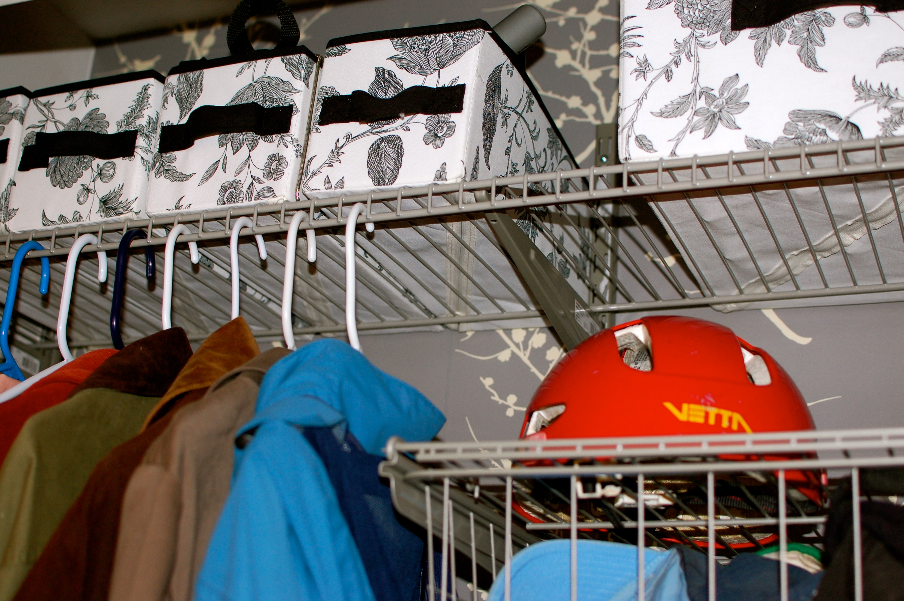 Next up, the installation of all of the crap. This is where things got even harder. We bought these screw-anchor things that are meant to be used so that you can hang heavier items without having to drill holes and without having to find studs in which to drill holes. Genius. But they really weren’t working for us. I don’t really know what the problem was, but it seemed as though the holes in the anchors were not large enough for the screws to fit through. Hmm. Anyway, after total frustration and the use of two different types of these screw-anchor things and me asking Aaron for help, the base structure of the closet organizer was finally affixed to the wall. Then I added the shelves and the drawers. I filled the shelves and  the drawers. I added the cubby boxes from the Ikea organizer and filled them with bike lights, tennis balls and camera equipment. My purses are upright and in cubby boxes. All of our scarves, hats and mittens are in sliding drawers. Spring coats and an umbrella hang from the high shelf.