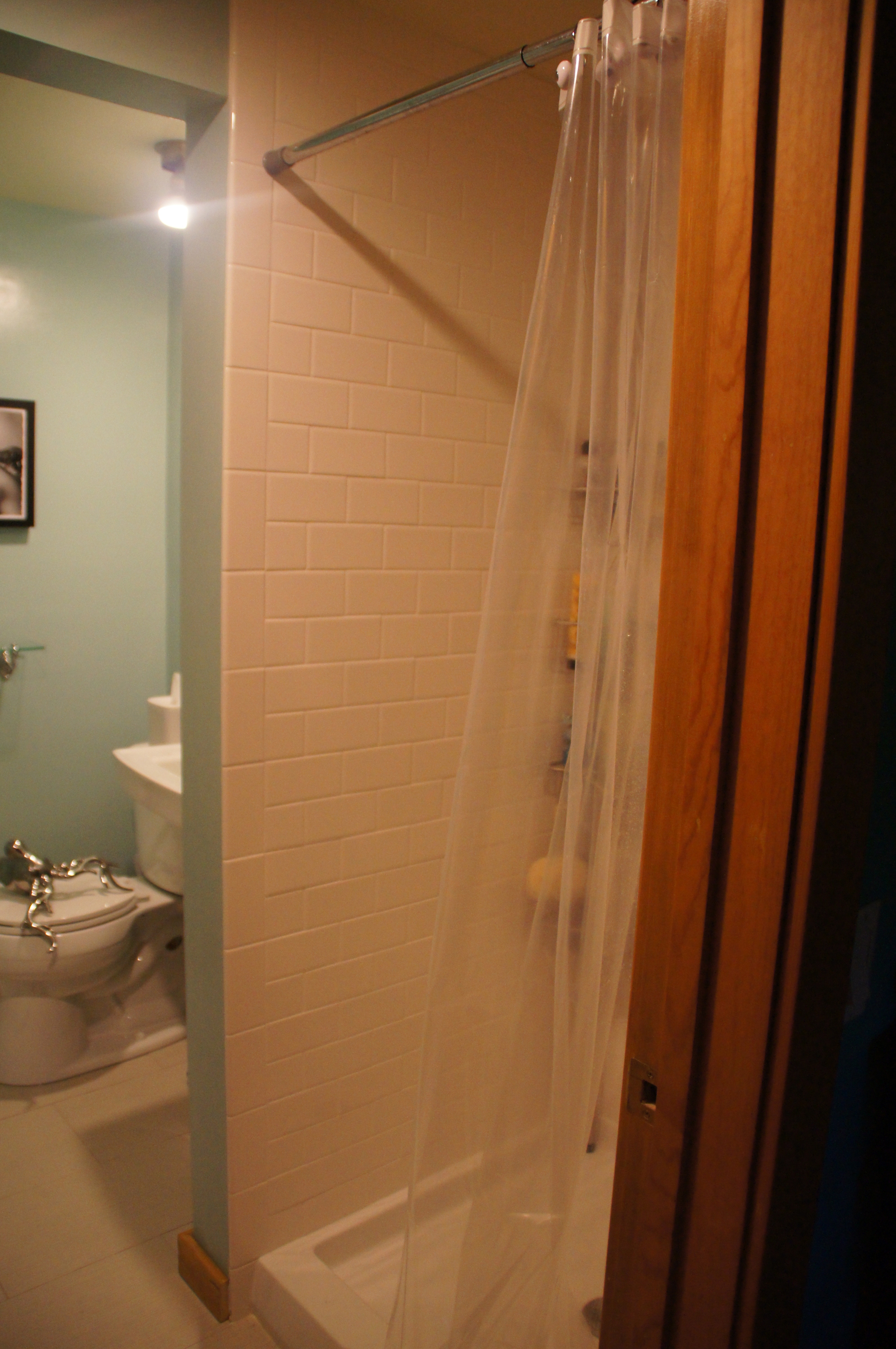 I think you get a pretty decent sense of the flooring difference in the above photos, too. Vinyl versus tile. Though our contractor guy insisted “they make really beautiful vinyl these days,” I have to disagree. I’m not against vinyl as an immutable rule, but geesh: it can’t compare to tile in a bath. Plus, because the bath is teeny it seemed the one place in the house we could probably afford to tile. Alright, what’s next? Ah! The shower! There wasn’t really anything wrong with the previous shower stall, but it just wasn’t very welcoming. And as someone who already showers a lot less frequently than she should, I didn’t need yet another excuse not to rinse off. [I had never showered in the downstairs bath — that’s seven years of avoidance — until we got the new shower.]