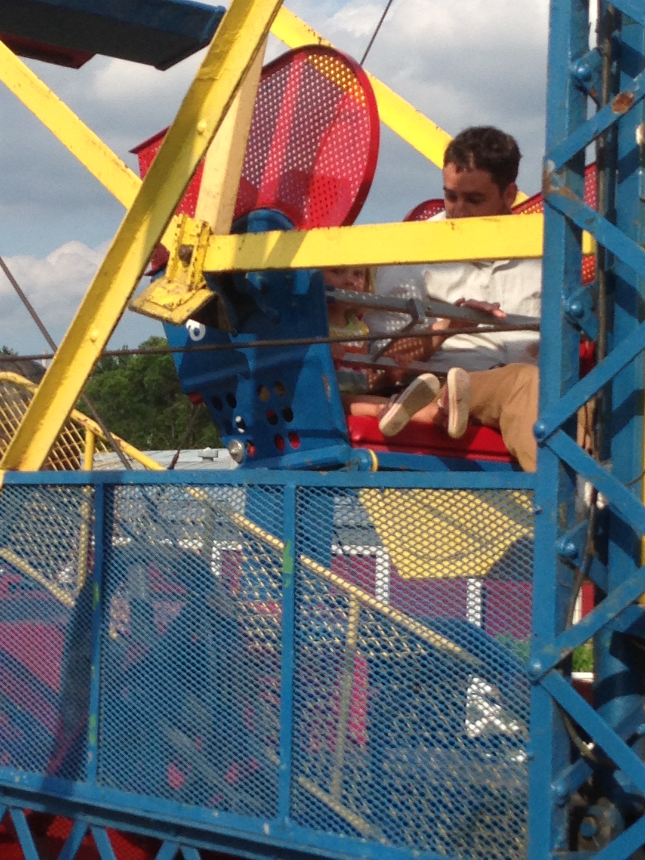 Molly on her first Ferris wheel ride, that’s what. Oy vey. I couldn’t get more pics because (a) my phone keeps telling me it’s at photo capacity (note to self: do something about that) and (b) everytime I looked at them, I went weak in the knees and started to cry. Literally, I cried. Please come down, I internally shouted. But Molly? Grinning from ear to ear and, when Aaron told her the ride was ending and they’d have to get off, shouted, “No!!!”
