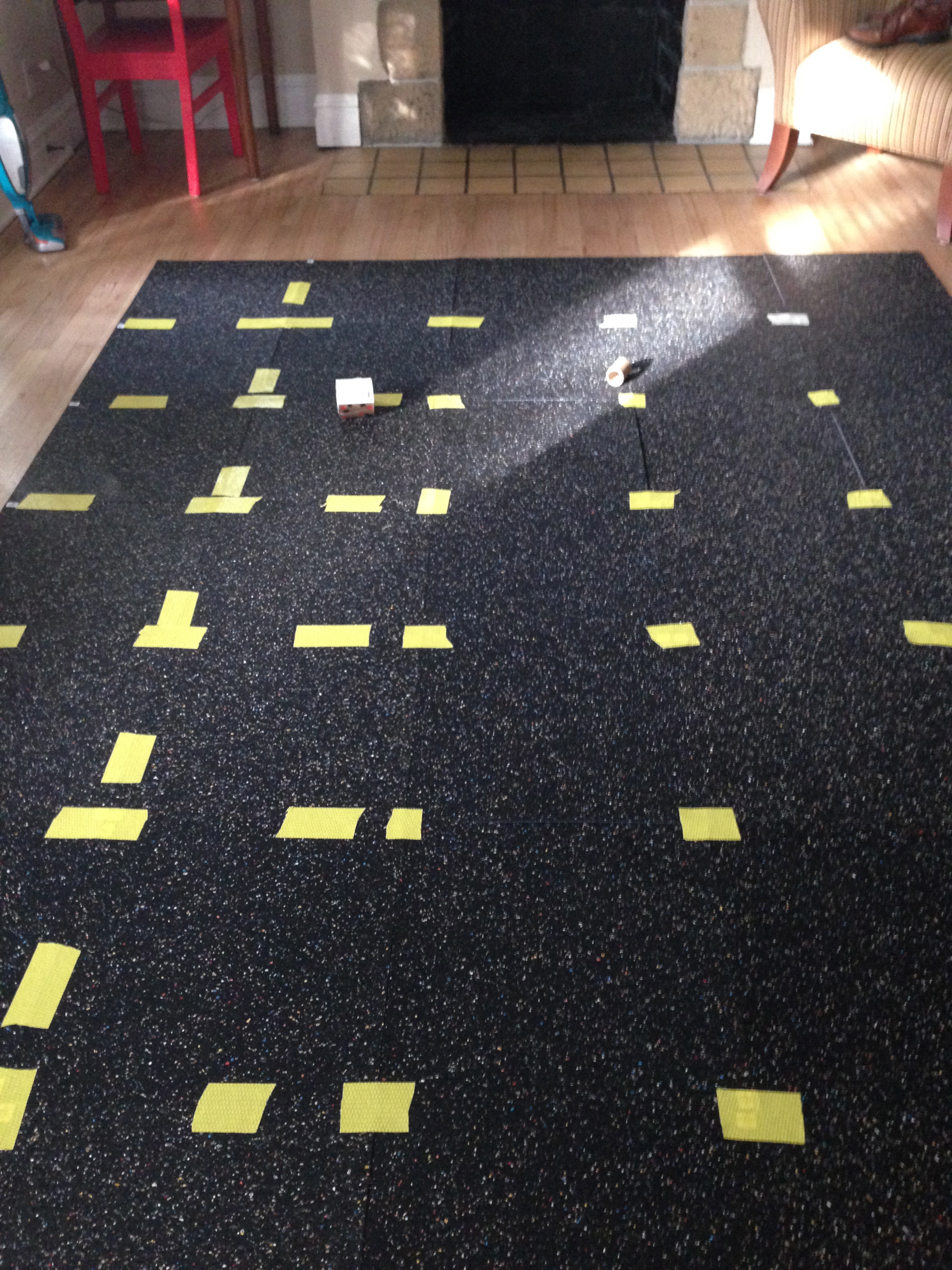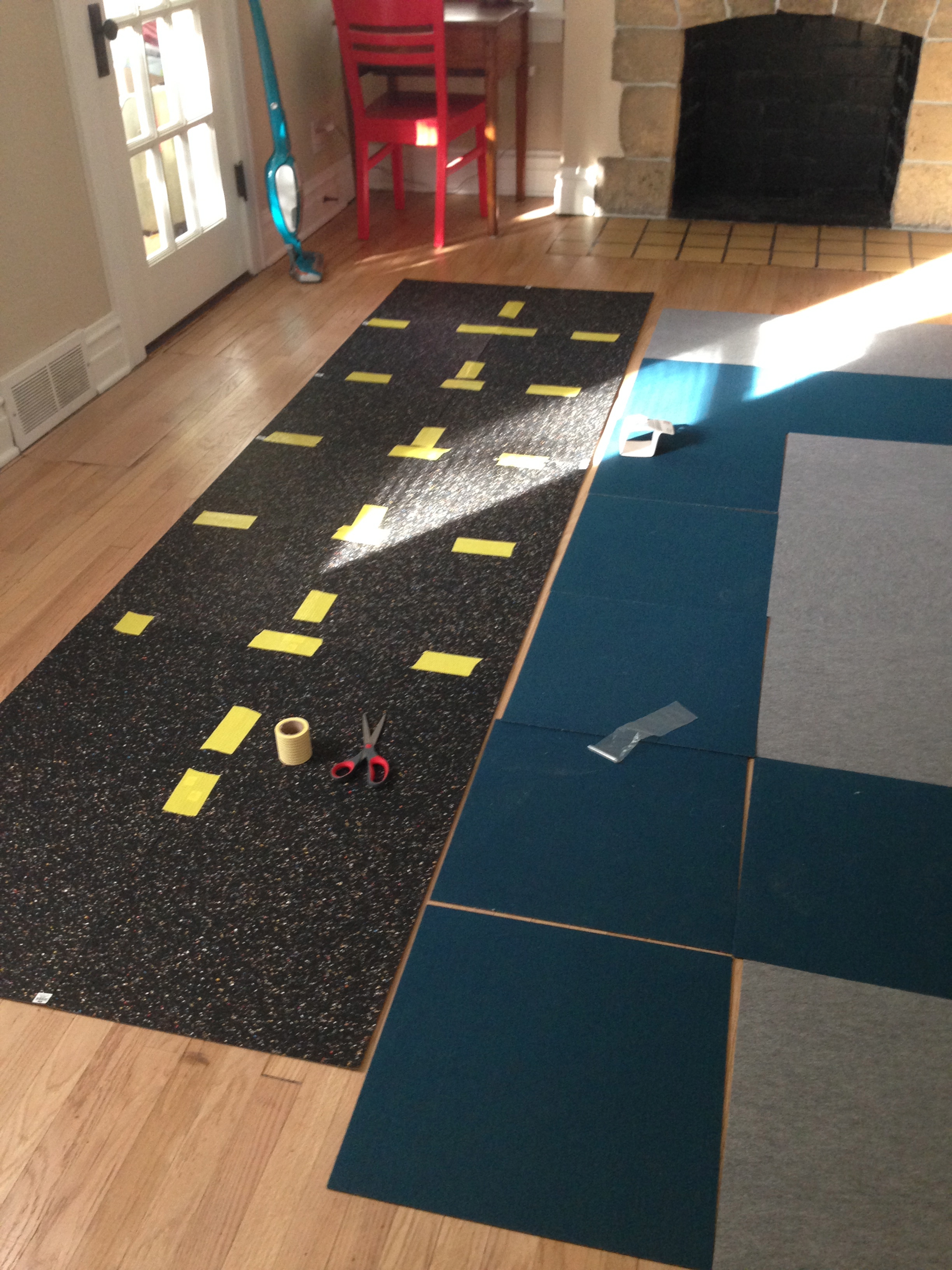 Ok, so I started out by moving the furniture, vacuuming the floor and setting the tiles in the pattern I wanted (well, Plan B of the pattern I wanted). Then I flipped them over, cut the rug gripper and began to attach it to corners and other seams of the squares.