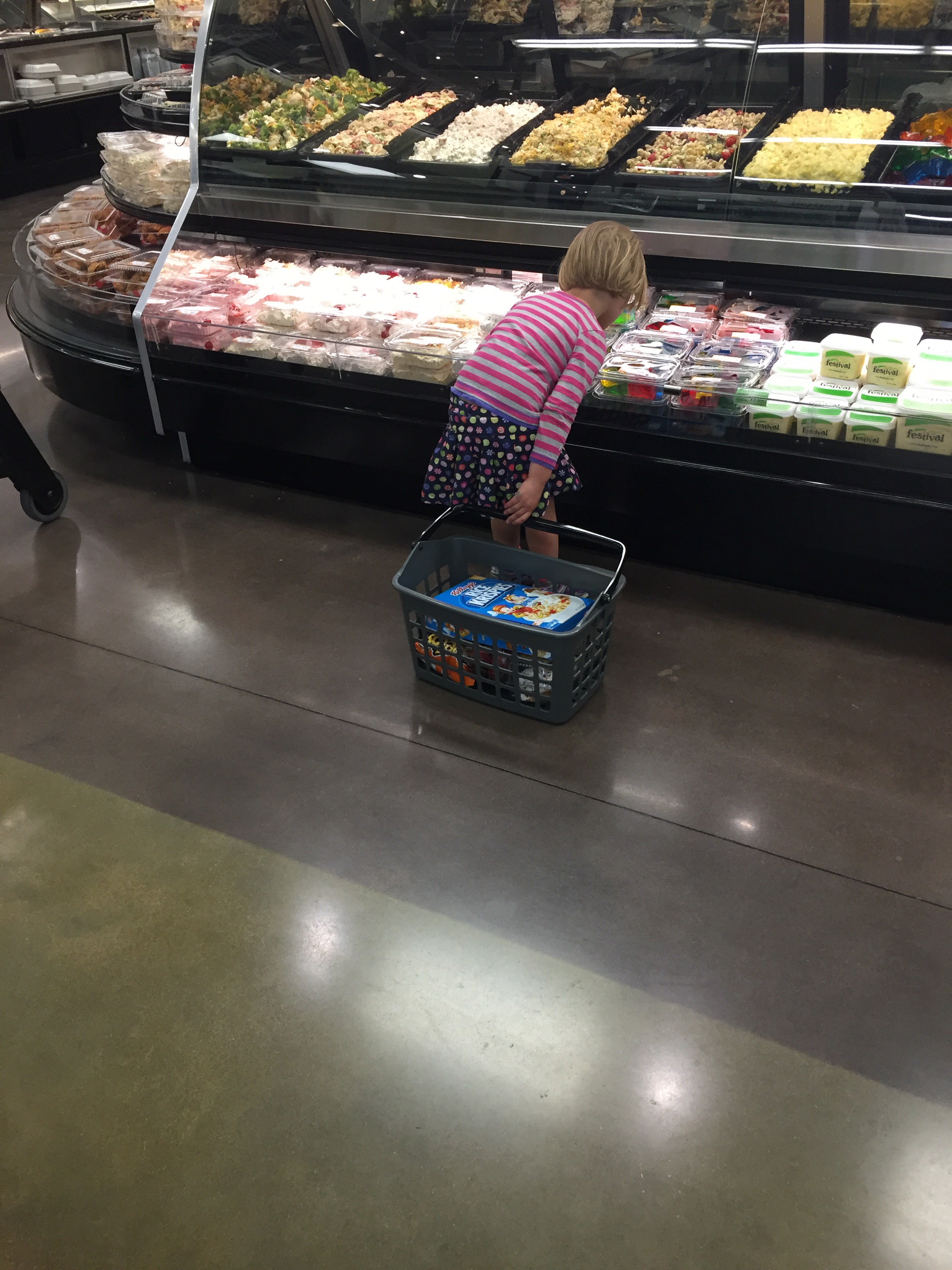 She just picks up a basket and goes in … Cheetos, doughnuts, strawberries, blackberries, deli Jell-0 (hello!), Rice Krispies, beef sticks … It was odd.