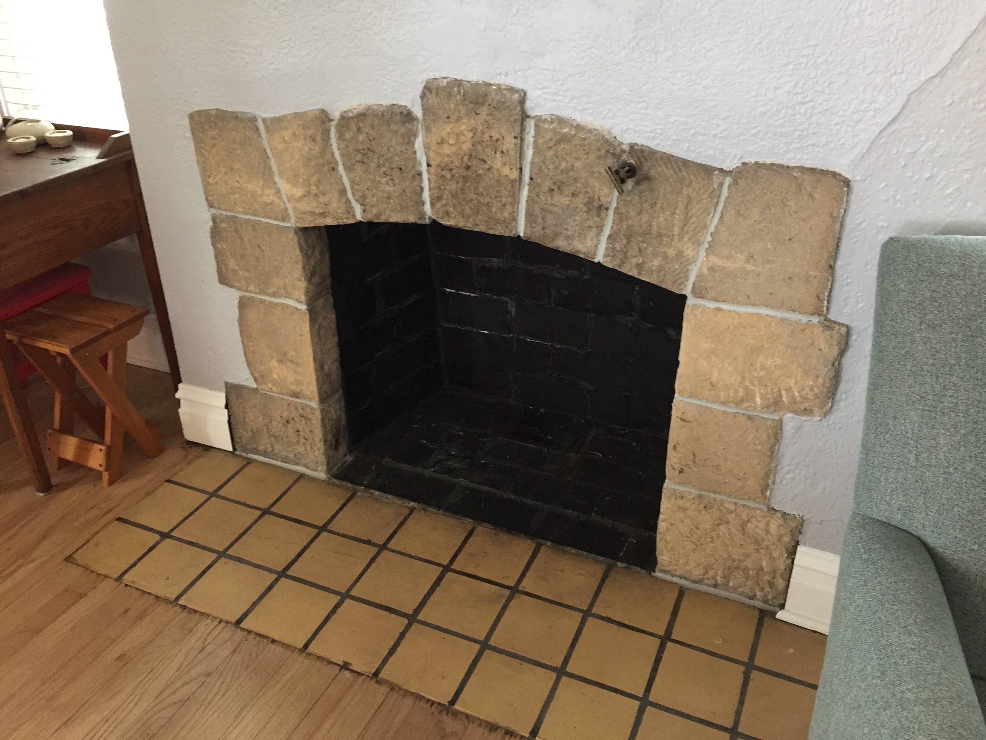 If you look carefully, you can see the disast-a-tent hanging out in the bottom of that shot. Oy vey. Anyway, moving on… The next project I’d like to share with you is titled Why in the Universe Did Someone Not Tell Me to Do This Immediately upon Moving in? or Holy Bananas I’m in Love! When I first saw our house, I thought the arched fireplace was particularly cute. But holy icky tile out front and the stone was so dirty. But I just kinda ignored it. I kept thinking we’d get to retiling at some point. I had a white and gray herringbone pattern in mind. And I also thought of painting the stones. But I kept staring. Or, rather, trying not to stare, because looking at it just made me sad. And I couldn’t really remember why I’d thought it was so cute. Here’s what it looked like last week or so.