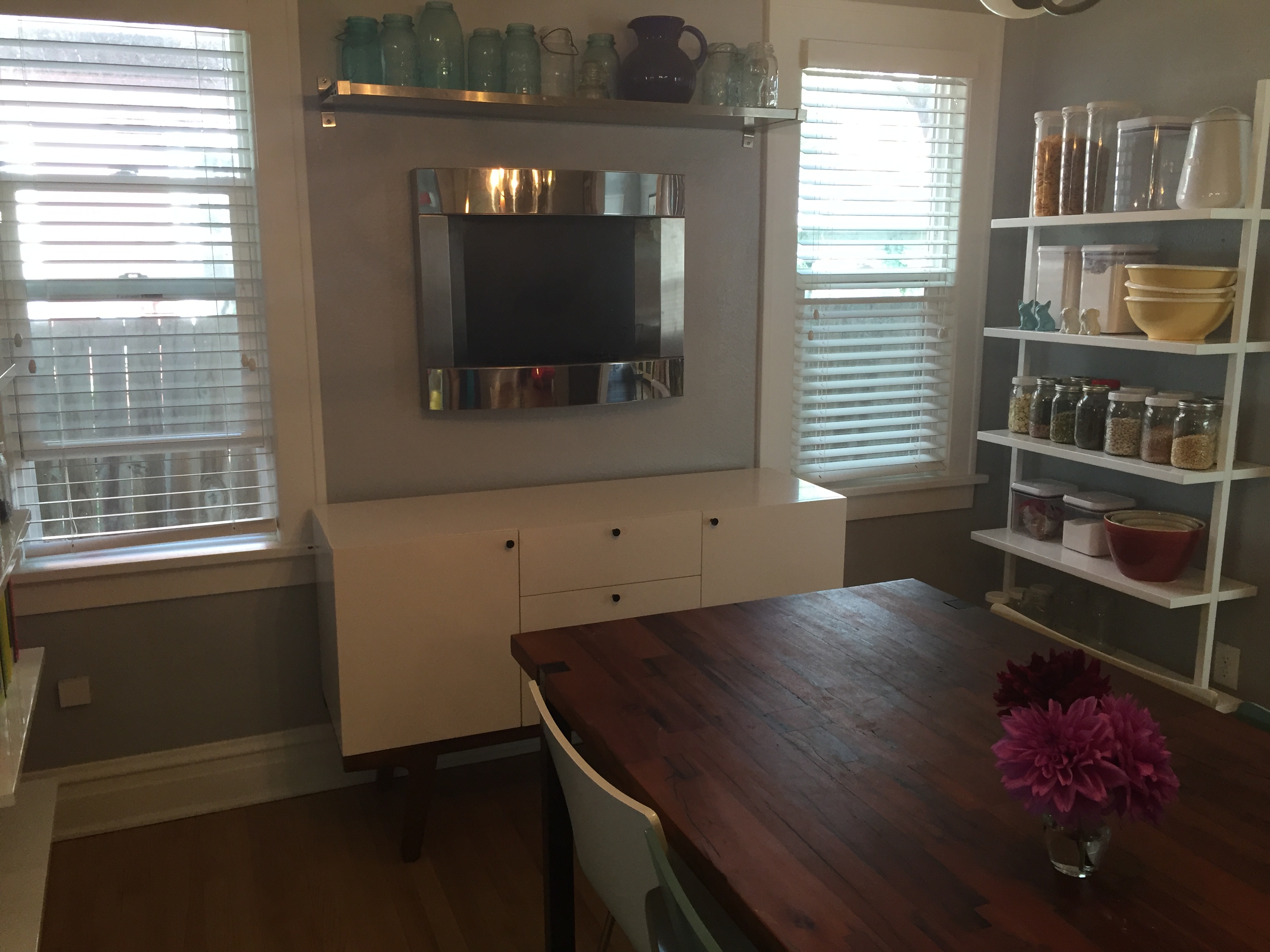 I’m struggling with a decent pic because the rest of the room was messy, but here you go. It’s brass and it kinda unites the milky white and brass one in the adjacent front room. It also LIGHTENS (as in weight-wise) the room immensely. I hadn’t realized until recently just how oppressive our other fixture had been. I don’t want to speak ill of dead-to-me like fixtures but Oy. It’s pretty, I guess, but didn’t work well in our small space. Or, you know, any space that gets dust. Or that is near a kitchen that is used.